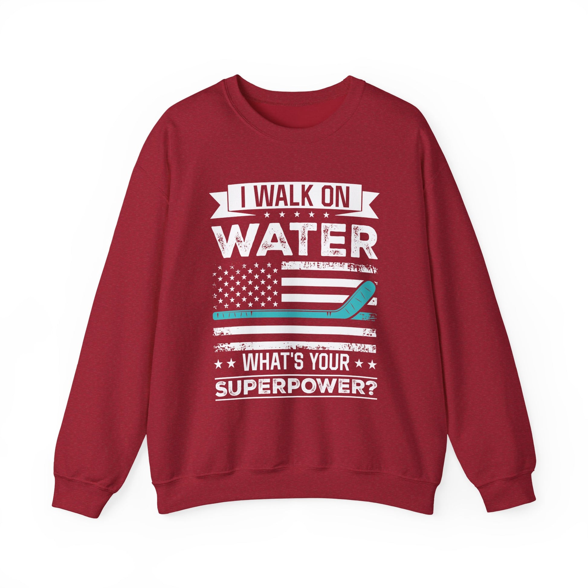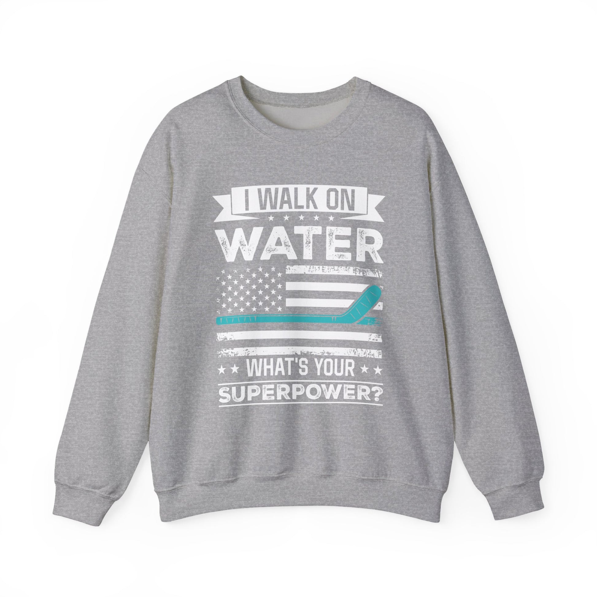 This crewneck sweatshirt carries a confident, playful hockey spirit — a warm, lived-in layer that reads like your favorite club tee. The front graphic reads “I WALK ON WATER — WHAT’S YOUR SUPERPOWER?” over a distressed American-flag motif with a teal stick accent. Lightweight-but-substantial 50/50 cotton-poly knit, ribbed collar and cuffs, and double-needle stitching give it structure and longevity while keeping the fit relaxed. Wear it after a dawn paddle, on chilly beach bonfires, or while swapping stories at the boat ramp — it settles into your rotation and starts conversations.