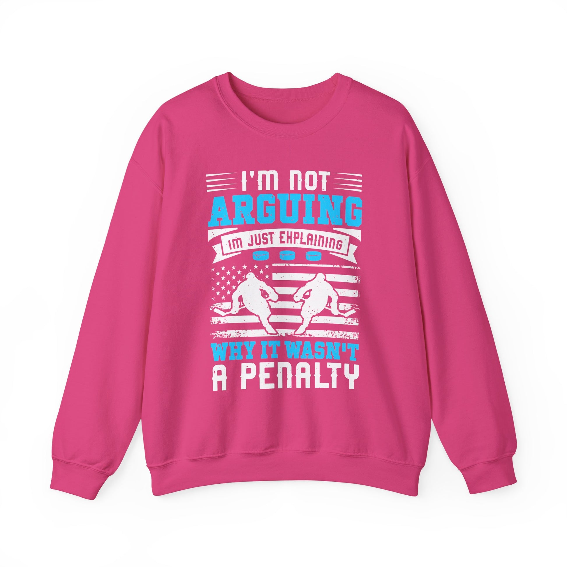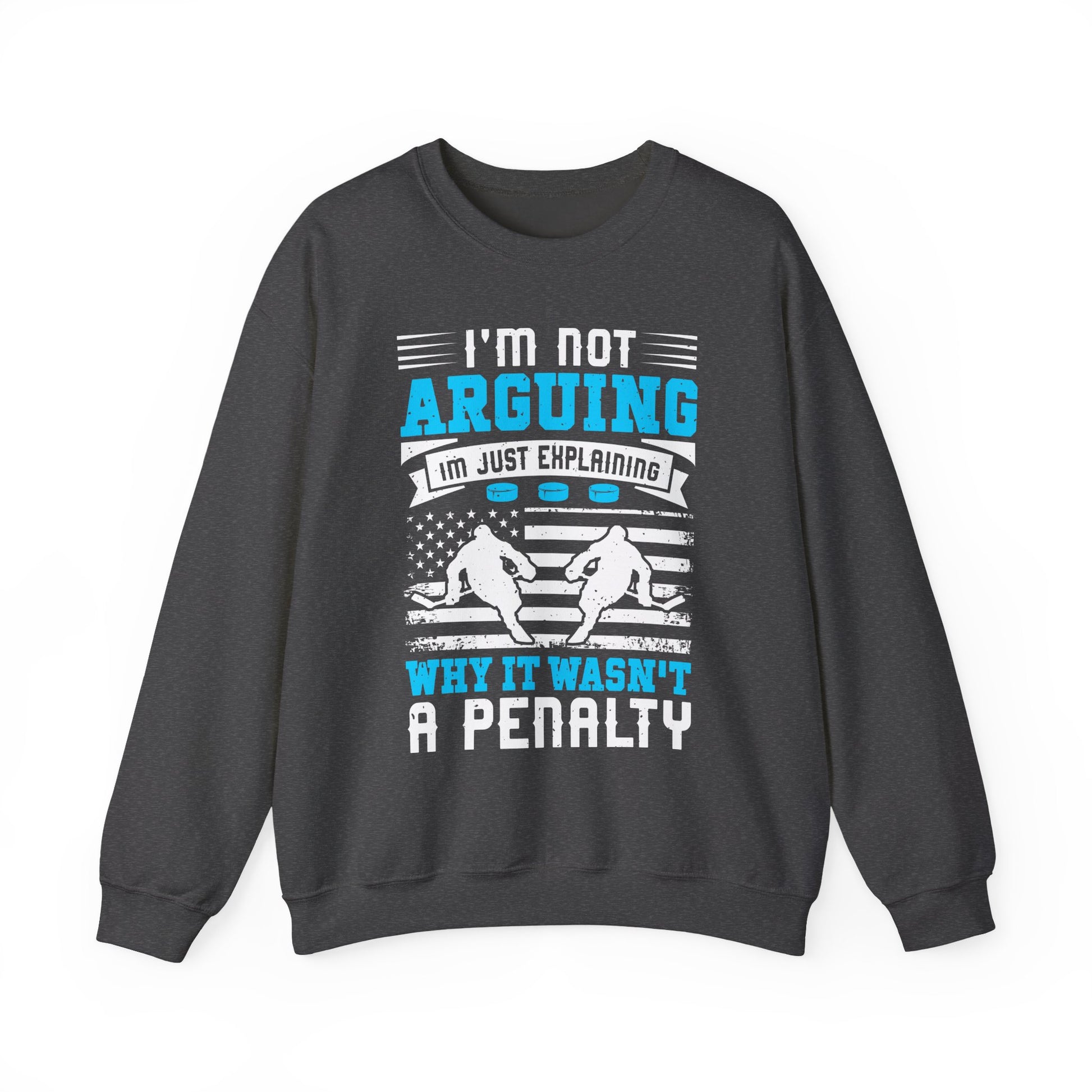 This cozy crewneck carries an attitude: crisp white fleece with a bold hockey graphic—goalie mask, crossed sticks and a gritty brushstroke that reads “I'm Not Arguing, I'm Explaining Why It Isn't a Penalty”. It feels like the locker room after a hard shift: warm, lived-in, and ready for the next game. The medium-heavy 50/50 blend holds shape, resists pilling, and layers easily over hoodies or jerseys. Wear it to practices, late-night stick-and-puck sessions, or when you want to rep your team vibe around town. The embroidered or printed neck and wrist detailing options add a touch of customization without changing the core clean-cut silhouette. Durable double-needle stitching and OEKO-TEX certified dyes mean this sweatshirt performs wash after wash while staying soft against the skin.